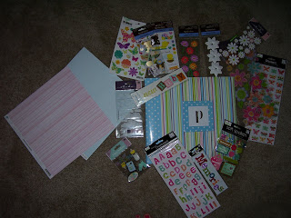 I wanted you all to be able to see the stuff we bought for our baby’s scrapbook. On the left, I put the two different kinds of paper we bought for it. One is light blue with little green and brown polka dots. The other is light pink with different shades of pink stripes on it. The pages of our book will alternate between these two sheets. For the first sheet we brought a green page and the last page a teal one.