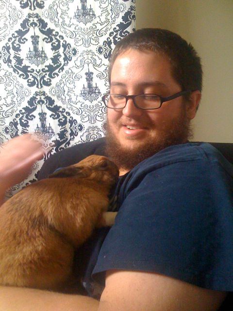 | John with Mega bunny this past Saturday. When the rabbit is super happy, his little ears lay flat as can be! |