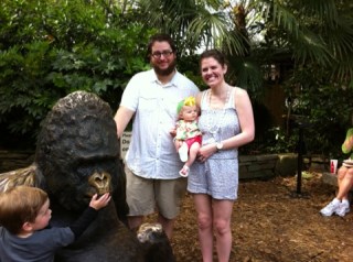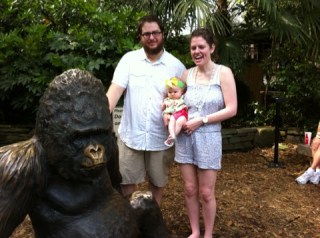 Immediately, some child ran up to the gorilla to touch it (you think it’s the kid in the above picture? you’d be wrong). The parents quickly yelled at the child that we were “trying to take a picture”, which let’s face it, I’m still trying to dangle my child off of the gorilla leg and my husband is getting snapped at because he just doesn’t understand my artistic expression. But, yeah, we’re trying to take a picture, kid. The perfect picture (in my brain anyways).